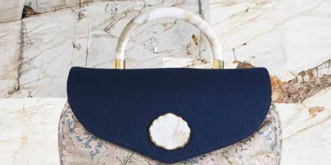 Soft melange blue-red-green fabric, the London handbag features real Calacatta marble shell and handle with brass finishes. On the back a gold coloured plate enhances the design.